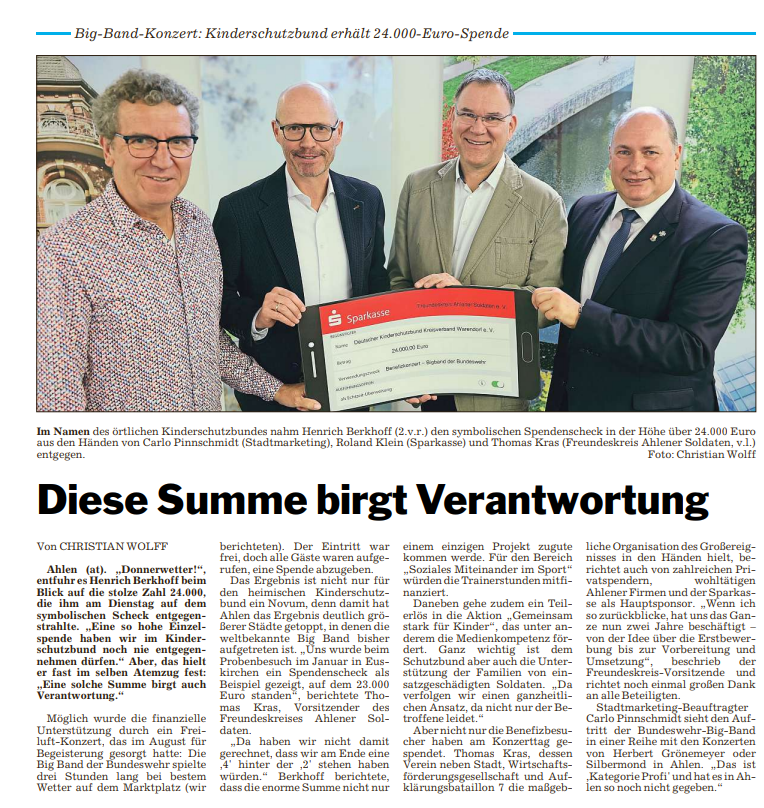 Möglich wurde die finanzielle Unterstützung durch ein Freiluft-Konzert, das im August für Begeisterung gesorgt hatte: Die Big Band der Bundeswehr spielte drei Stunden lang bei bestem Wetter auf dem Marktplatz (...)"